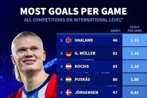 体育资讯10月13日讯 德国转会市场统计了足坛历史球员在国家队的场均进球数量,并列出榜单,哈兰德1.11球居首,盖德-穆勒、柯奇士次席。