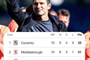 体育资讯10月19日讯 在本轮英冠联赛,兰帕德执教的考文垂以2-0击败布莱克本。考文垂本赛季前10场英冠6胜4平保持不败,在积分榜上以1分优势领先米德尔斯堡位居榜首,球队10场比赛打进29球(联赛最多),只丢7球(已经连续5场零封)。